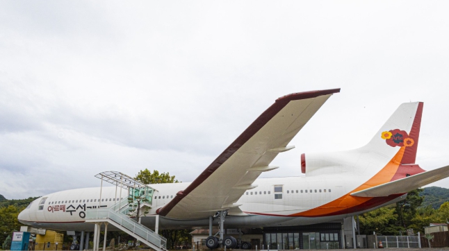 비행기 좌석에 앉아 창밖 수성못 풍경을 감상할 수 있어