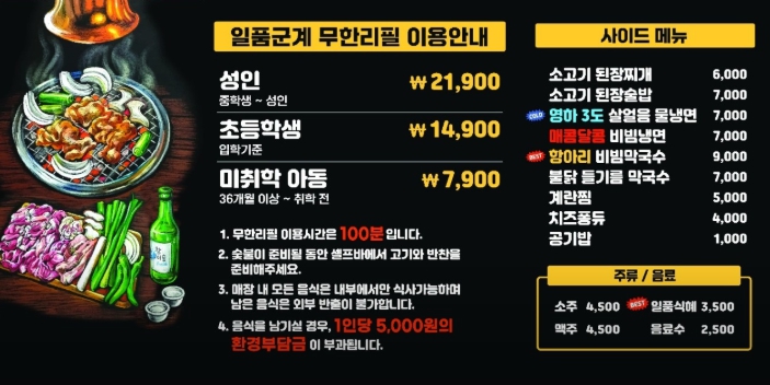 • 무한리필 이용 시: 대인 24,900원 / 소인 16,900원 / 유아 7,900원