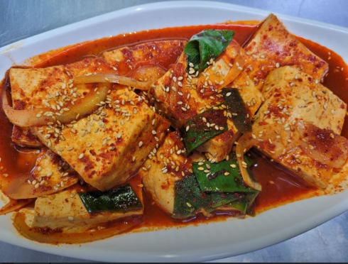 직접 만든 두부에 비법 육수를 더해 만든 인기 반찬입니다. 파뿌리, 코다리 머리, 양파껍질로 우려낸 육수를 사용해 깊은 맛이 납니다.