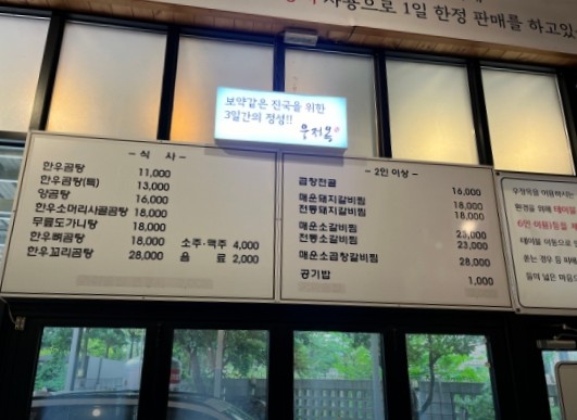 - 한우곰탕: 11,000원 (국내산 한우 뼈로 72시간 고아낸 진국)
