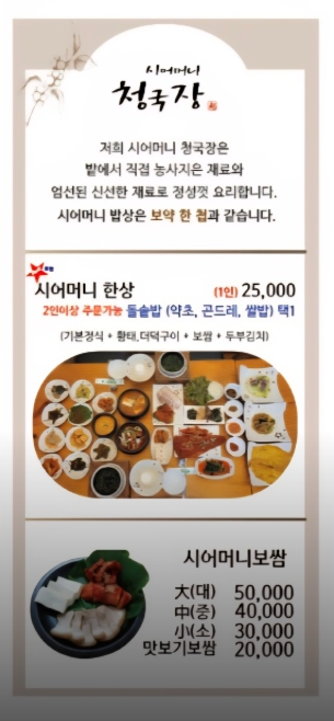 • 시어머니 한상: 25,000원 (기본정식 + 황태, 더덕구이 + 보쌈 + 시어머니 손두부 포함)